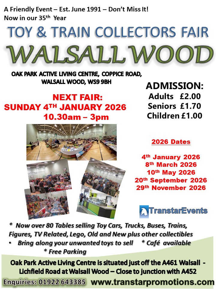 Following our Toy and Train Fair at the Oak Park Active Living Centre, Walsall Wood on Sunday 30th November, 2025 we look forward to welcoming you all again to our next event on Sunday 4th January, 2026